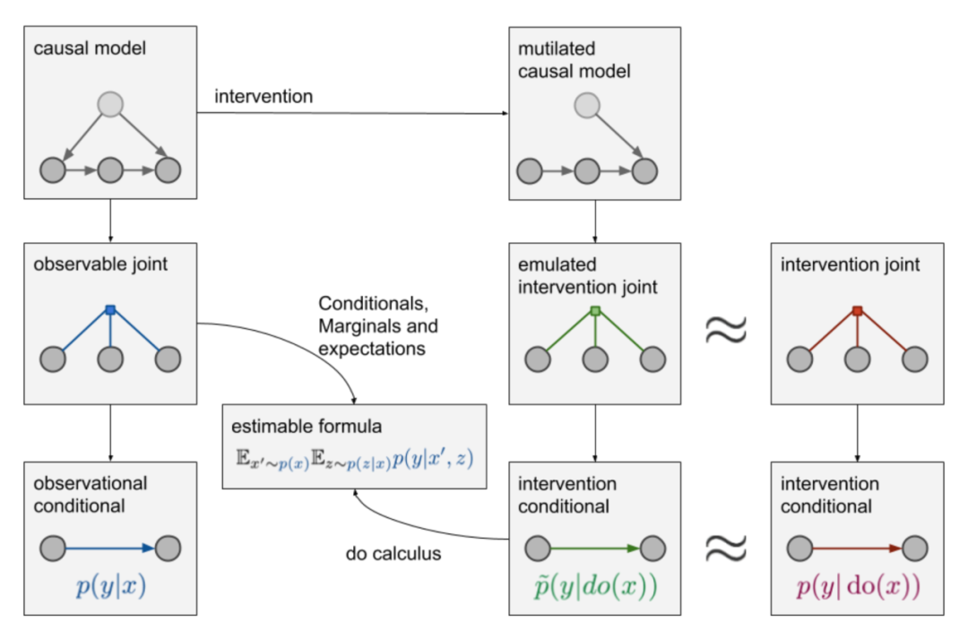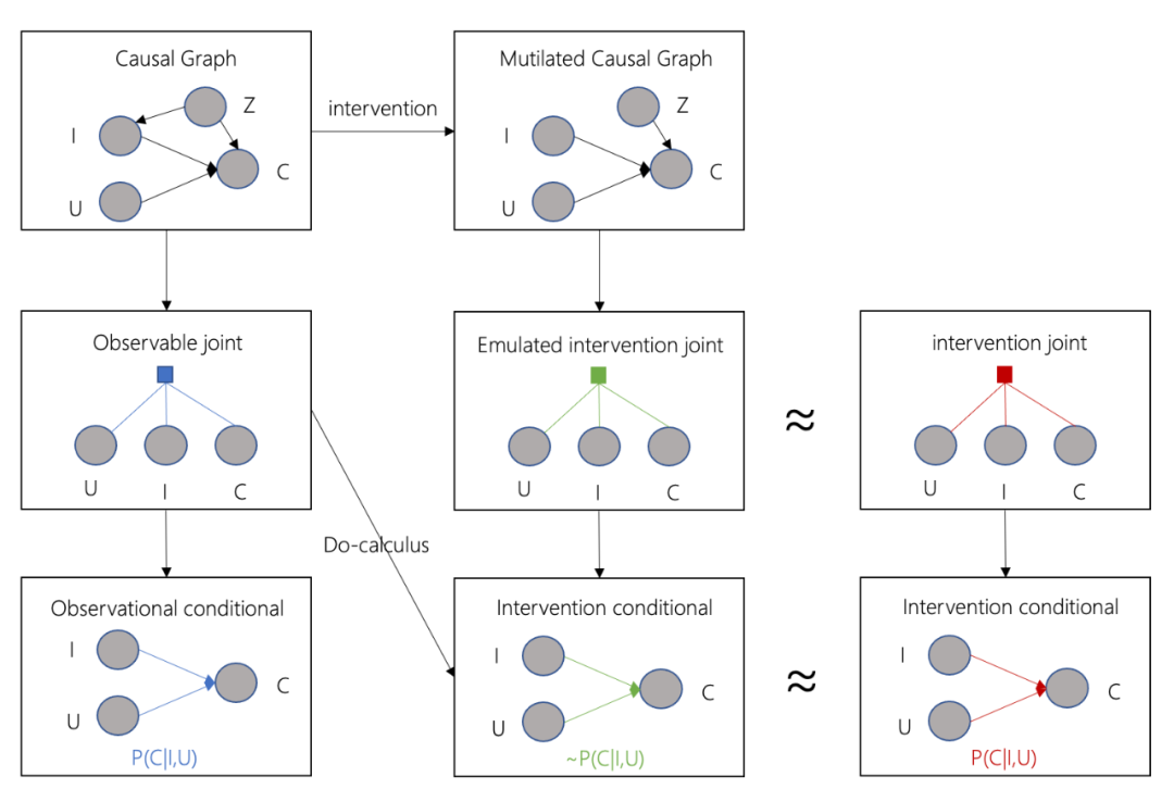 emulated intervention joint也只是我们假设出来的分布,我们仍然没有具体的数据,但是引入causal graph的好处是,基于这个先验知识,在满足一定假设时,我们就能够使用do-calculus[6],在仅有observable joint的情况下,求解,也就得到了