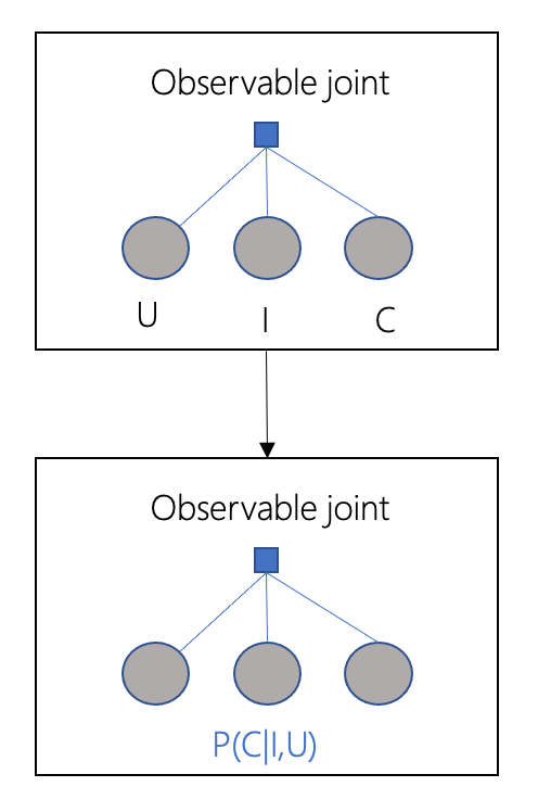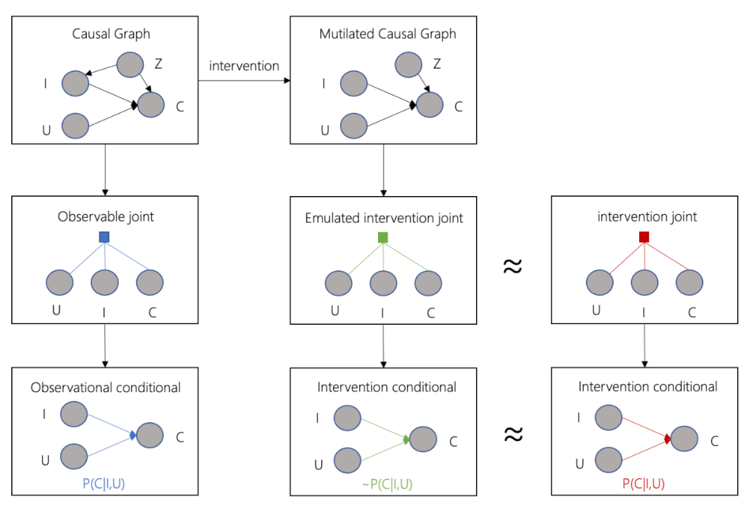 同理,如果我们能够根据干扰后的联合概率分布(intervention joint)获得观测数据,我们也能用监督学习的方式求解,但是实际上,我们并没有这样的数据,那么,基于人工经验,创造表示变量之间因果关系的causal graph,如果因果图比较正确,通过主动干预,我们能获得与intervention joint近似的联合概率分布(emulated intervention joint),从而得到的近似计算结果