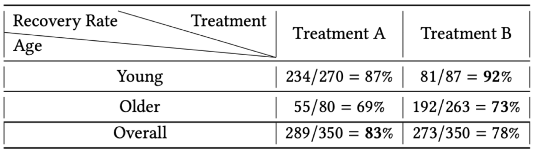 例子3:该例子引用自[3],医院有两种药Treatment A和treatment B,有两个350个患者组成的实验组,其中,第一个实验组有年轻人(Young)270名,老年人(Older)80名,第二个实验组有年轻人87名,老年人263名,两个组的患者分别服用两种药,第一个实验组有234名年轻人被治愈,55名老年人被治愈,第二个实验组有81名年轻人被治愈,192名老年人被治愈。在这个数据中,最奇怪的点是,从观测数据中的overall部分可以看到,treatment A的治愈率高于treatment B,但是从年轻人和老年人的分层数据来看,treatment A的治愈率均低于treatment B。