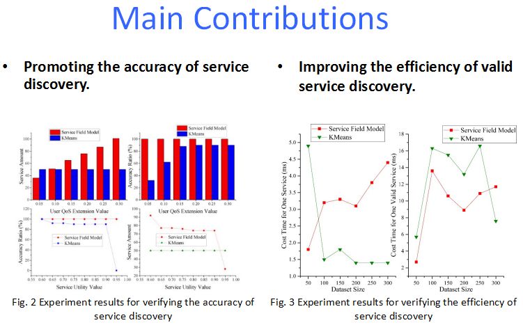 本文的贡献有三个方面。首先,本文使用服务能级的抽象来表示服务的状态,以及提出了服务跃迁机制研究云服务在不同能级下的变化和重新划分。其次,本文提出了一个用户可接受服务域的概念用来描述满足用户请求的服务,以及相应的服务发现方法,这样就可以显著减少服务的搜索范围并且提高服务发现的速度和准确度。第三,本文设计了一系列算法来实现场模型的生成、用户可接受服务域的生成、服务跃迁机制和面向用户的服务发现。本文使用QWS数据集进行了大量实验,以验证和评估本文提出的模型和算法。实验结果表明,本文提出的场模型能够很好地支持多云环境下服务的动态和可演化特性的表征,并且本文提出的算法可以提高服务发现的准确性和效率。