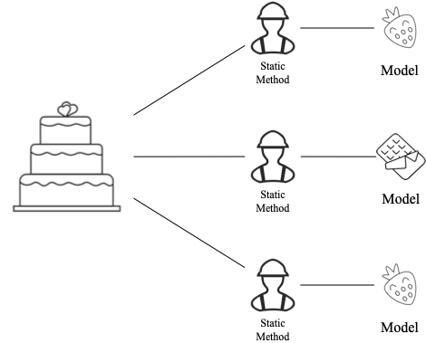 在 Static Method 的模式中,技术团队将 View 抽象为一块蛋糕,蛋糕上面需要奶油,柠檬,樱桃(Model)等食材,所有负责输送材料的加工厂(Static Method)派工人(而不是厨师)将材料直接运送并摆放在蛋糕上面,如图 3 所示。这使得蛋糕最后拥有了所有他该有的食材成分。但这些食材存在随意摆放,使蛋糕变得混乱的情况,如果再继续这样堆砌食材,它就不再像是一块蛋糕了。
