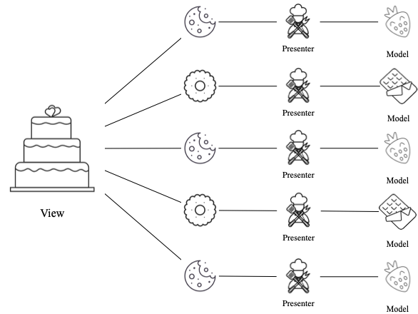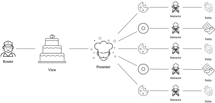 在符合领域驱动设计的 VIPER 架构设计模式下,一块蛋糕(View)只由一个主厨(Presenter)进行装饰摆放,但是蛋糕上所有的饰品食材,都由这位主厨指派给多个不同的厨师(Interactor)进行加工(Entity)。当这些厨师加工完毕后,再把材料送过来,通知主厨,由主厨亲自进行摆放。