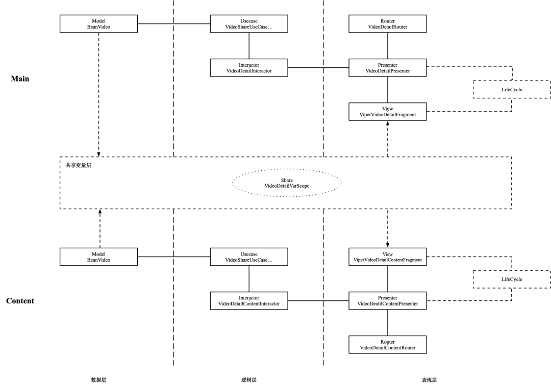 基于 DDD 的思想,新闻客户端实现了一套包含 UseCase 的基础框架,划分出了领域模型,由于视频详情页由多 Fragment 组成,技术团队还加入了共享变量层,使拥有统一生命周期的组件之间能解耦传递数据,重构后的视频详情页整体架构如图 8 所示。