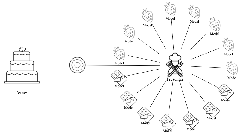Presenter 与 View 为一对一的方式,就像一块蛋糕(View),指派给一个厨师(Presenter)去制作,但是厨师一个人需要做的事情太多,他需要亲自加工食材(Model),再将这些材料一一装饰在蛋糕上面,如图 4 所示。如果这时候再告诉他我们的蛋糕还需要添加一些突然增加的装饰和点缀,他可能会面临崩溃。