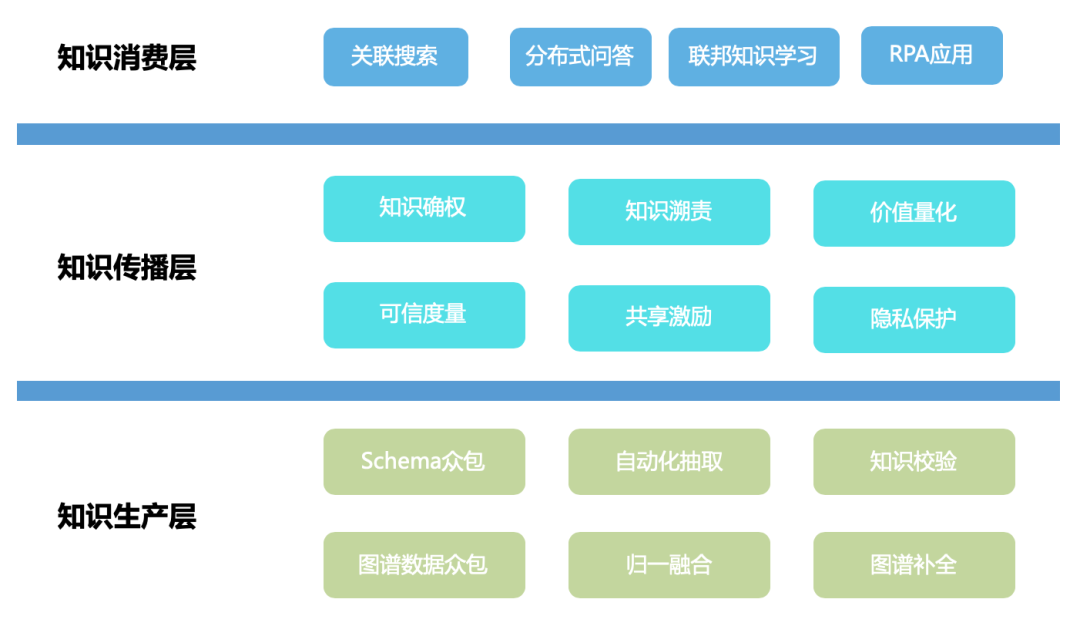 如图3所示,完整的知识图谱构建和消费需要考虑知识生产、知识传播和知识消费三个层次。知识生产层对应传统的如知识建模、抽取、融合、校验等技术。知识的传播层责需要考虑知识的价值量化、知识确权、知识溯责、知识的可信度量、知识众包的共享激励以及数据的隐私保护。知识消费层包含有搜索问答、推理分析、联邦知识学习,以及流程自动化如RPA等各种需要建立在分散式知识源的系列应用。