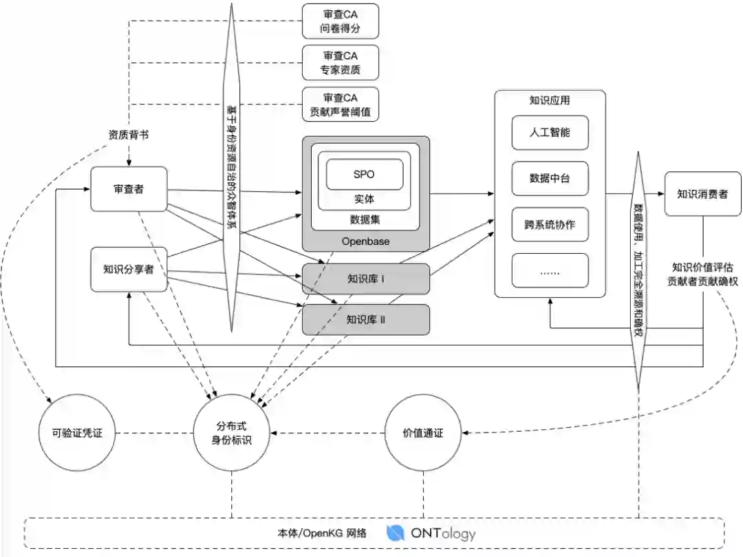 通过OpenKG的分布式数字身份体系,支持用户个人数据贡献的链上资质认定、确权和实际使用的逻辑。任意知识使用场景可以自主开发应用平台,通过分布式身份标识的可验证凭证对用户资质进行校验,方便知识贡献并为知识使用者提供知识服务。