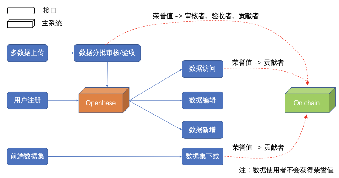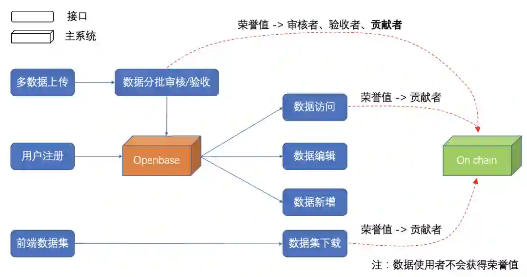 在本次的平台中,将有新冠科研、新冠健康等数个知识图谱的众包过程将被记录到区块链中。每一个知识图谱的贡献者都会被记录到链上。用户在注册的时候,OpenBase通过接口与链端进行关联;登入OpenBase系统后,一系列的操作会被传入到链端,但是访问数据不会对访问者奖励荣誉值,只会对原来数据的贡献者奖励。