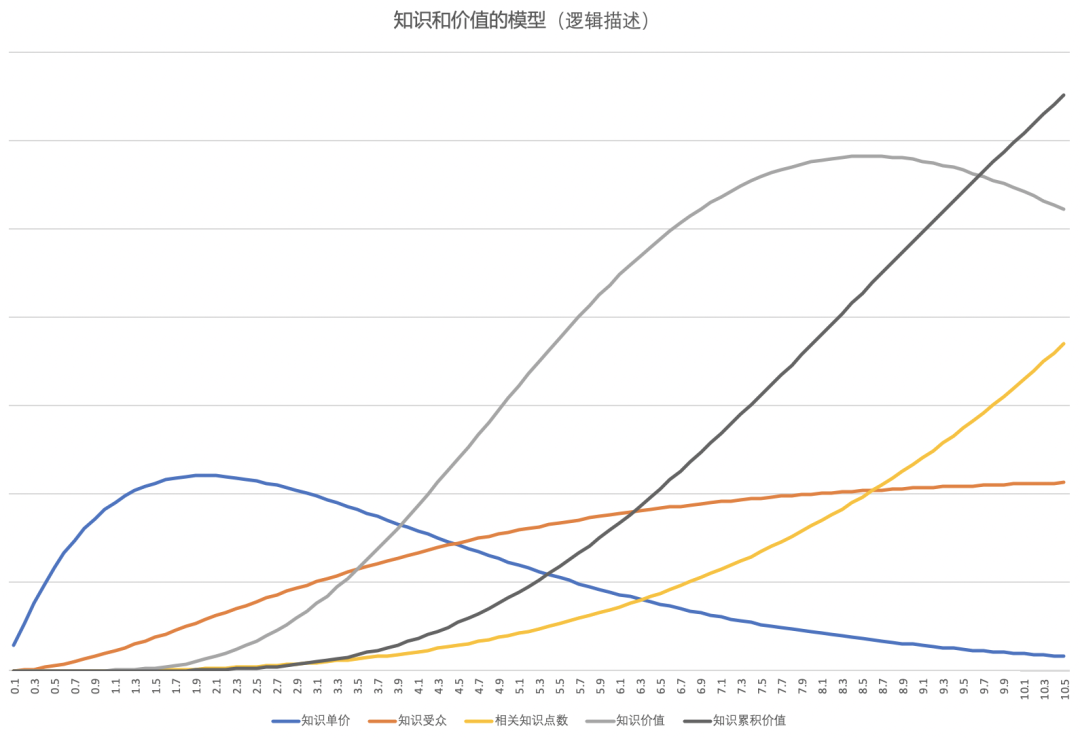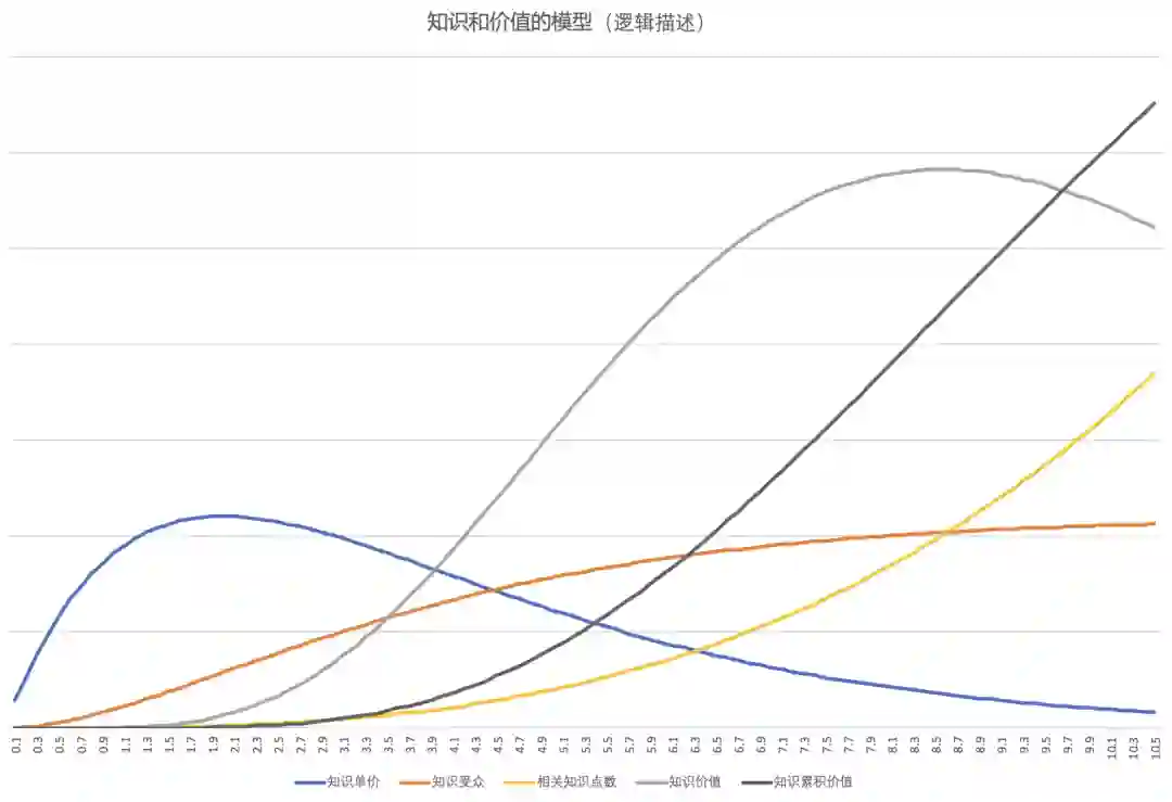 知识单位价值发展的过程,当少数人了解的时候,单位价值较高,随着越来越多的接受和使用,逐渐降低。 |