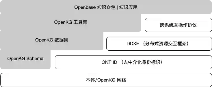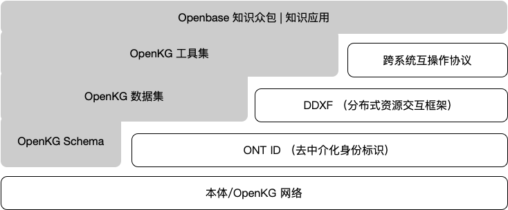 在联邦知识图谱和业务应用层面,以分布式(去中介化)身份标识协议(ONT ID)识别知识点、知识关系、知识贡献者和知识使用者,以分布式资源交互框架(DDXF)管理和追踪知识发展和实用全过程,以跨系统互操作协议支持知识在不同系统中的业务服务。