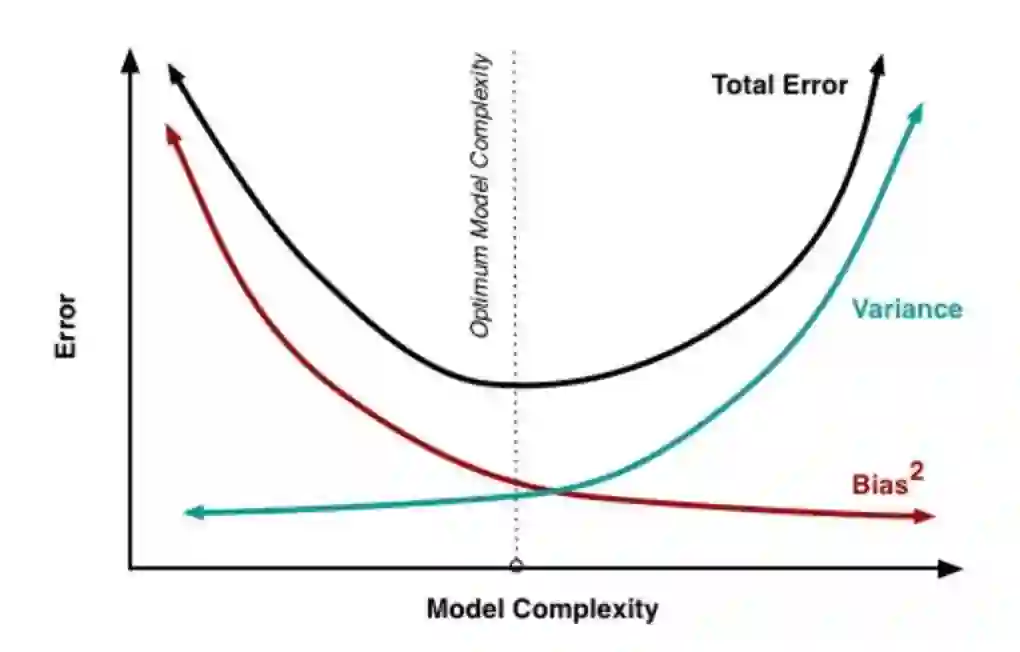 图1:横坐标:模型复杂性;纵坐标:误差;红线:偏差;绿线:方差;黑线:总体误差;虚线:最优模型复杂性
