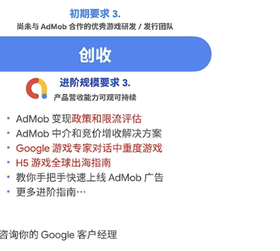创收阶段,为开发者提供 AdMob 变现政策和限流评估及 AdMob 中介和竞价增收解决方案。