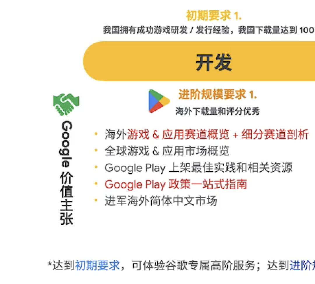 开发阶段,利用谷歌大数据可对游戏 & 应用进行细分赛道剖析。与谷歌游戏专家一同挖掘游戏 & 应用更大的营收空间,或拓展更多如 H5 游戏的新赛道机会。并提供 Google Play 关键政策解读,以及 Google Play 简体中文版出海方案。