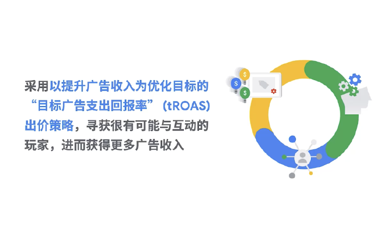 目标广告支出回报率 (tROAS) 出价策略以提升广告收入为优化目标,寻获很有可能与广告互动的玩家。