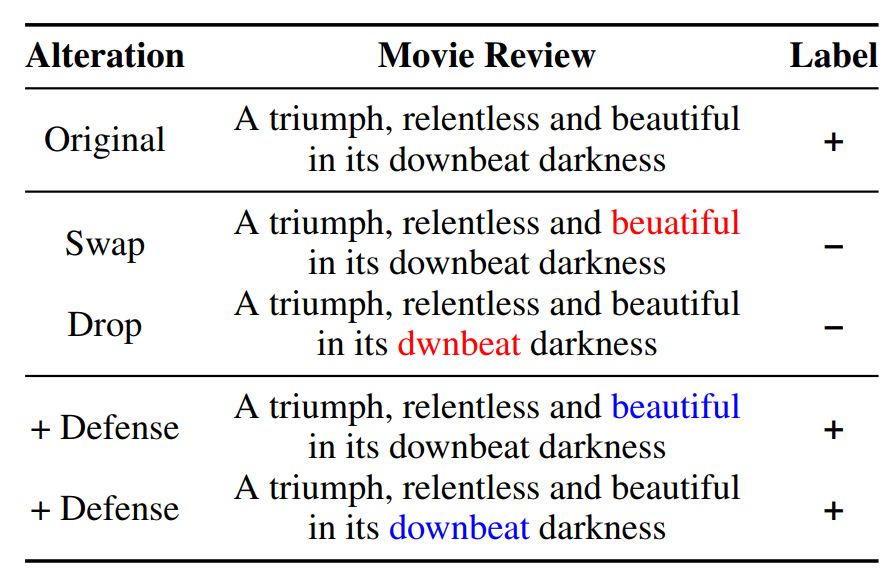 与图像领域一样,有进攻就会有防御,目前也有很多研究尝试构建更鲁棒的自然语言处理模型。例如在 CMU 的一篇对抗性拼写错误论文(arXiv:1905.11268)中,研究者通过移除、添加或调序单词内部的字符,以构建更稳健的文本分类模型。这些增减或调序都是一种扰动,就像人类也很可能出现这些笔误一样。通过这些扰动,模型能学会如何处理错别字,从而不至于对分类结果产生影响。