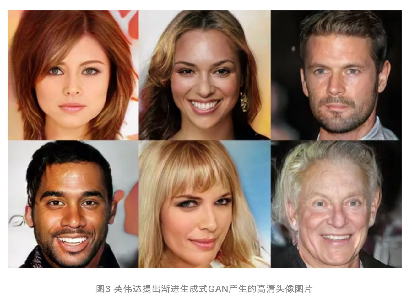 另外一项值得关注的技术是英伟达采取“渐进式生成”技术路线的GAN方案,这项方案的引人之处在于使得计算机可以生成1024*1024大小的高清图片,它是目前无论图像清晰度还是图片生成质量都达到最好效果的技术,其生成的明星图片几乎可以达到以假乱真的效果(参考图3)。
