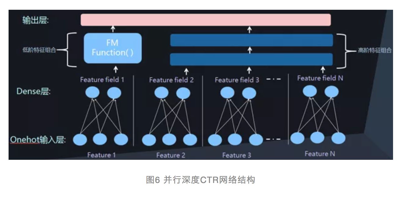 这三个网络结构特点基本囊括了目前所有深度CTR模型。图6和图7是两种常见的深度CTR网络结构,目前所有模型基本都采用了其中之一种结构。