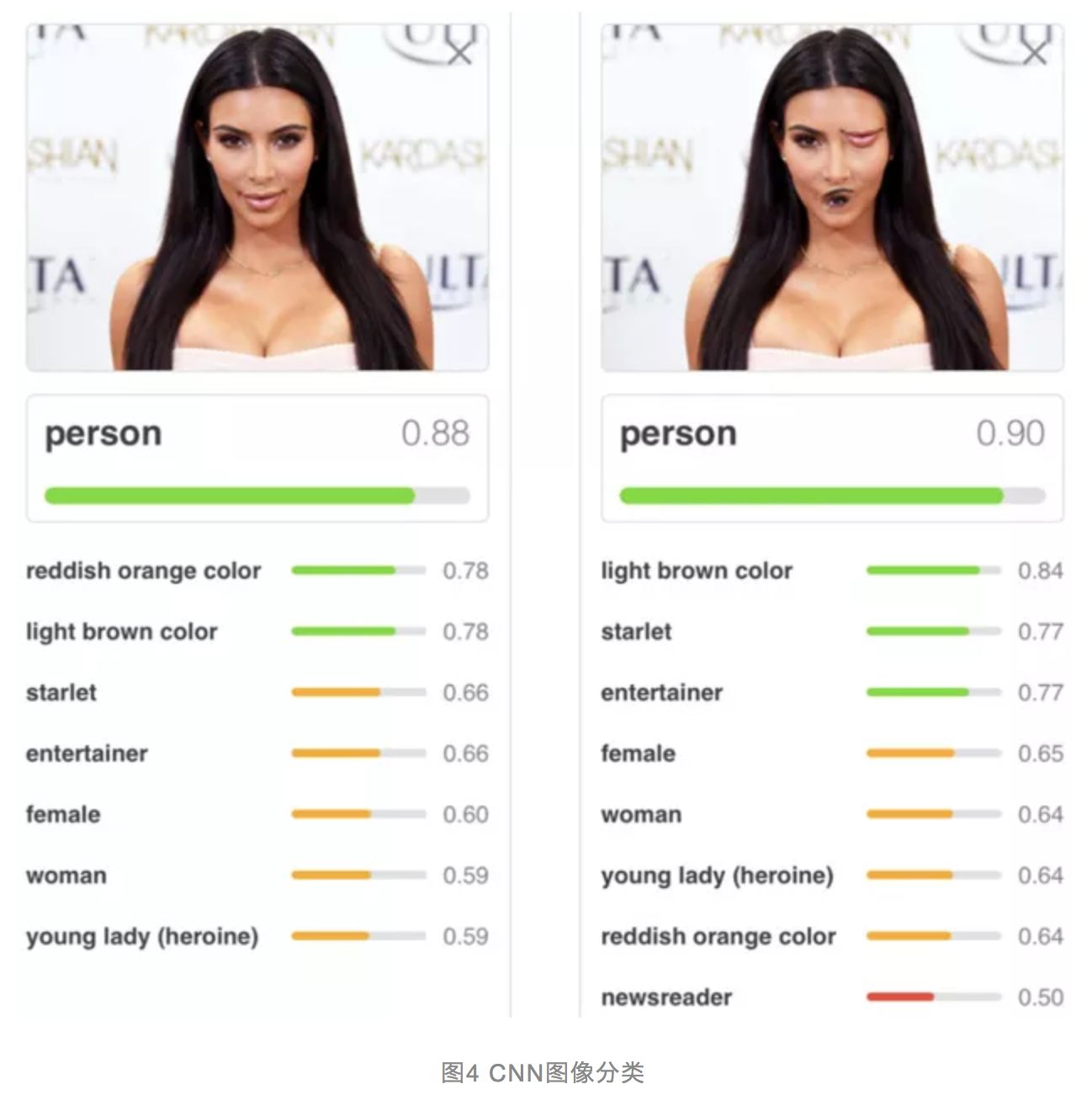 在上面这张图中,给出两张人像照片,通过CNN给出照片所属类别及其对应的概率。第一张照片是一张正常的人脸照片,CNN能够正确识别出是“人类”的类别并给出归属概率值0.88。第二张图片把人脸中的嘴巴和眼睛对调了下位置,对于人来说不会认为这是一张正常人的脸,但是CNN仍然识别为人类而且置信度不降反增为0.90。