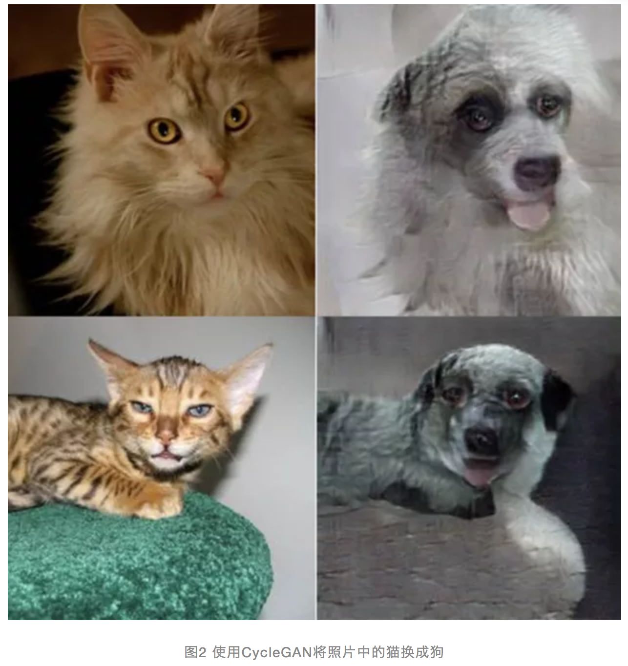GAN具备非常广泛的应用场景,比如图像风格转换、超分辨率图像构建、自动黑白图片上色、图片实体属性编辑(例如自动给人像增加胡子、切换头发颜色等属性变换),不同领域图片之间的转换(例如同一个场景春天的图片自动转换为秋天的图片,或者白天景色自动转换为夜间的景色),甚至是图像实体的动态替换,比如把一幅图片或者视频中出现的猫换成狗(参考图2)。