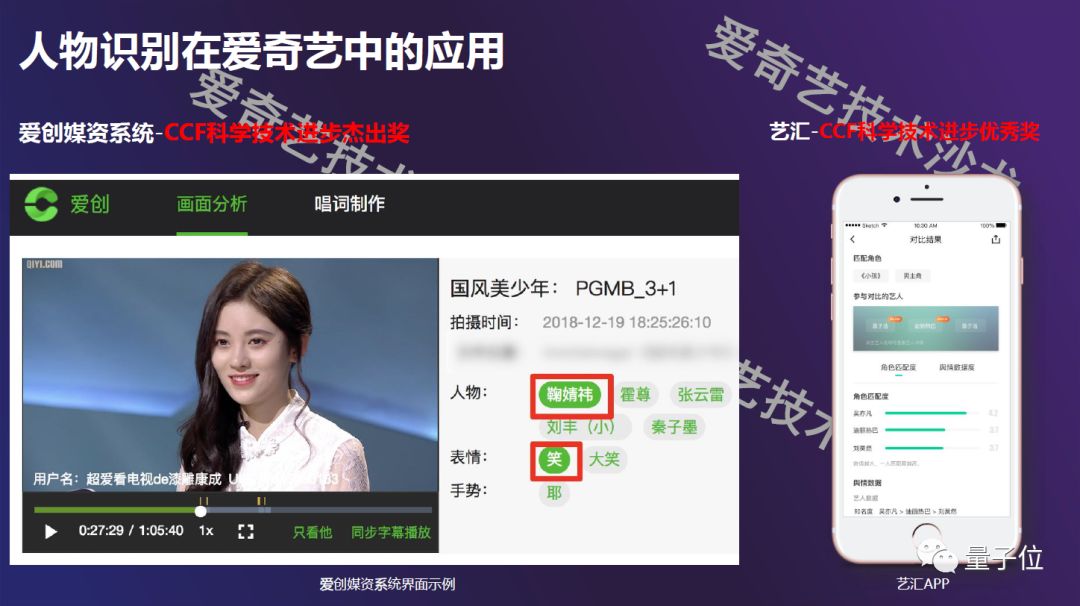 “爱创媒资系统”应用于后期制作,“艺汇”可应用于导演智能选角。这两个应用在2018年分别获得CCF科学技术进步杰出奖和优秀奖。