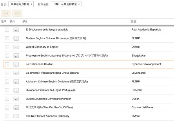 你也可以通过相关途径购买词典然后通过 USB 连接到 PC,然后将词典复制到 Documents 的 Dictionaries 中,接着打开 Kindle,单击右上方的点点点→设备选项→语言和词典→词典→选择自己默认需要的中文和英文的词典。接着,便可开始畅游你的阅读世界了,下图为原生配置的词典☟