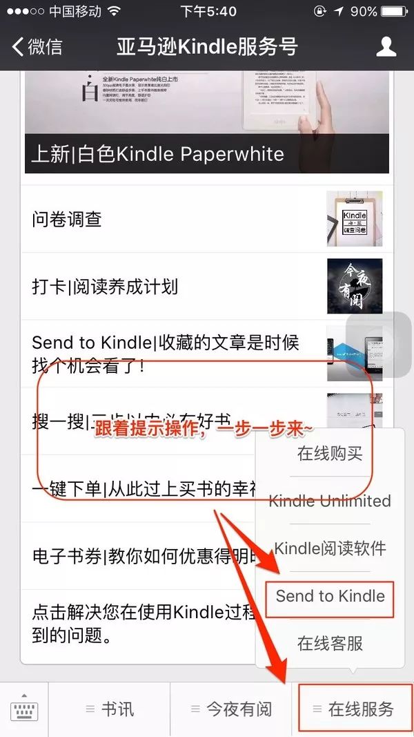5. Send to Kindle:大家应该都知道可以通过公众号推送内容到 Kindle 吧?没错,在亚马逊的服务号(微信号:cn_kindle)就提供了 Send to Kindle 的功能,只要你看到喜欢的内容,就可以简单操作后进行推送了。