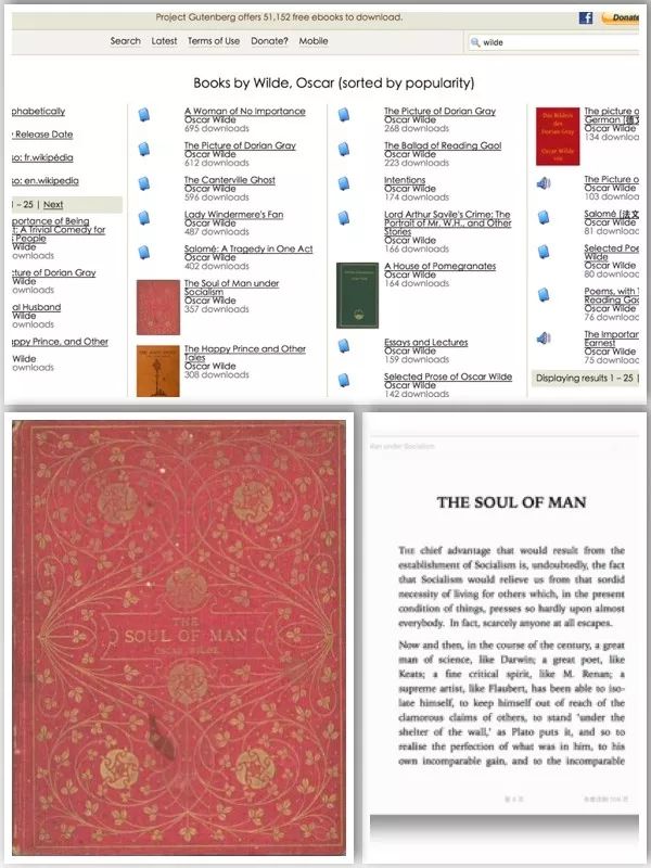 古腾堡计划(Project Gutenberg,简称 PG)是世界上第一个数字图书馆,书籍所涉范围十分之广,包括小说、诗歌、故事、喜剧、食谱、期刊等超过 100000 册的书籍可供下载。在豆瓣发现一个豆友甚至一口气下了王尔德的《狱中记》、《雷丁监狱之歌》以及剧本无数,这得有多少网友在义务地做这些事情啊!