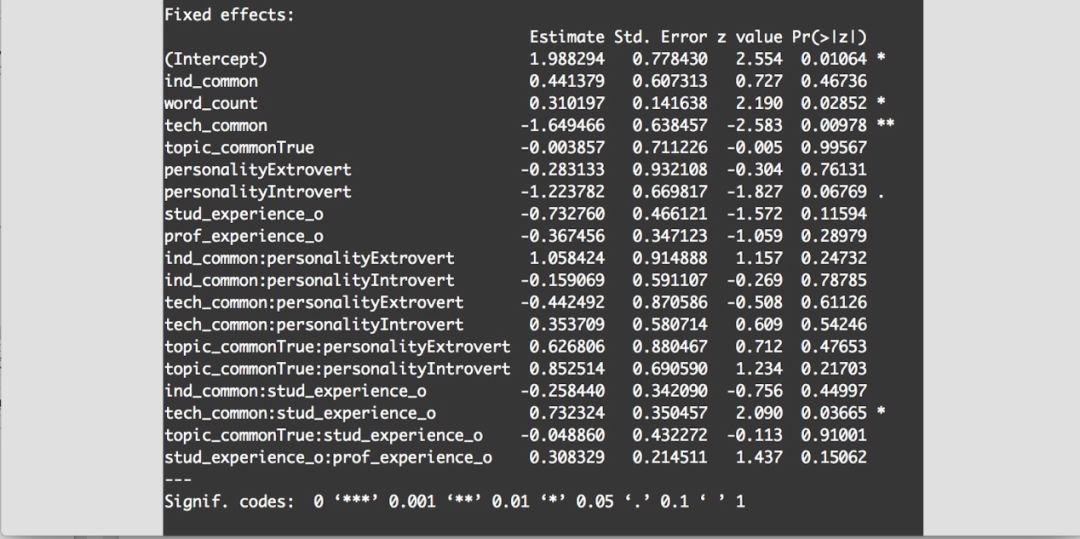 为了确定哪些变量对满分评价有更大贡献,我们对18个特征进行逻辑回归。结果显示word_count, tech_common, and tech_common:stud_experience_o是影响最显著的变量。其中word_count是学生和导师共同使用的单词的数量;tech_common是一个布尔值,当学生和导师有相同的技术兴趣时,它的值为True;tech_common:stud_experience_o是一个变量,这个变量结合了tech_common的效果还有学生已达到的教育水平。