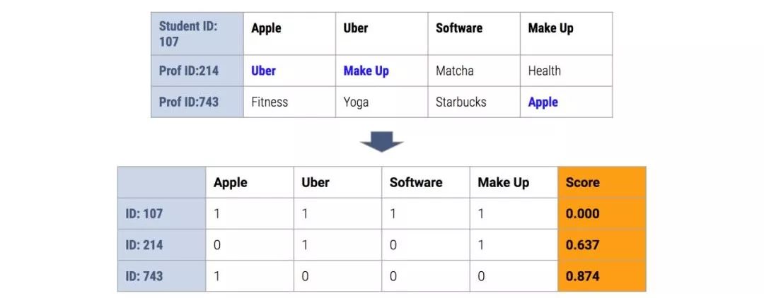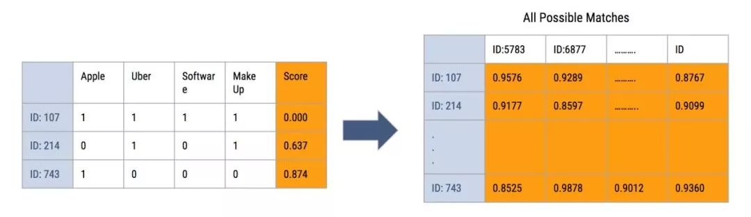 逻辑回归的公式会计算一个0到1之间的值,这是得到目标结果的概率,在本案例中是得到5星评价的概率。我们的目标当然是得到更高的概率。计算所有可能配对的得分并将其放到矩阵中。数据格式化的方式很重要,因为它将生成输入配对算法的原始数据。