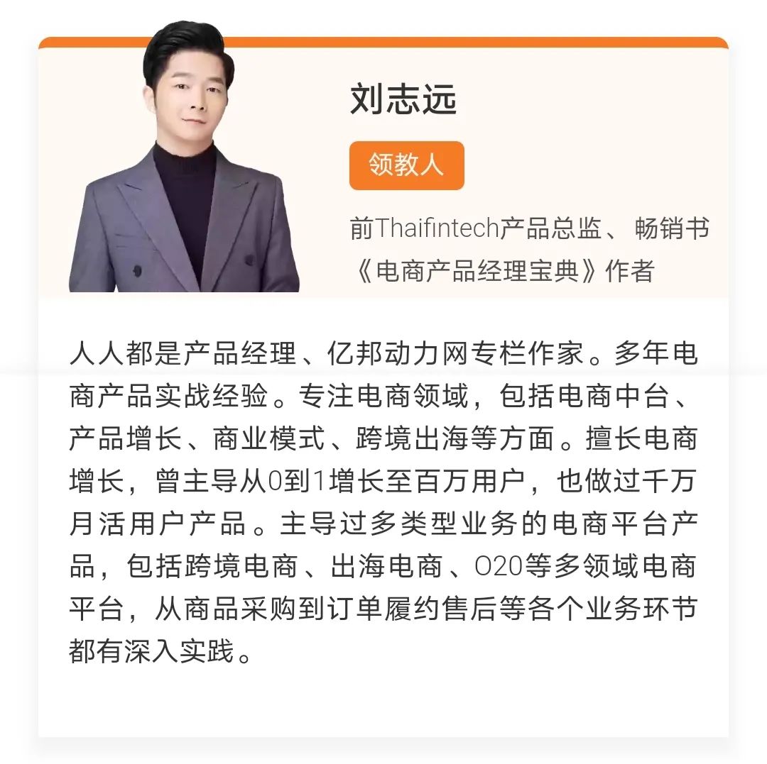 刘志远老师有多年电商产品实战经验。专注电商领域,包括电商中台、产品增长、商业模式、跨境出海等方面。