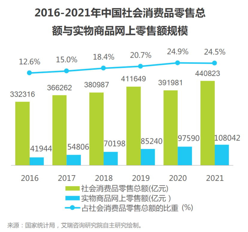 而从数据上看,从上世纪末开始,中国电商发展的步伐就从未停止。根据国家统计局数据,2021年全国网上零售额同比增长 14.1%,其中实物商品网上零售同比增长 12.0%,目前仍在快速增长中。同时,实物商品网上零售额占比接近四分之一;零售业还有四分之三的“蓝海”,等着互联网的覆盖。