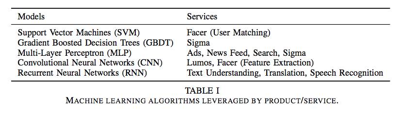 所有基于机器学习的服务都使用“特征”(或输入)来产生量化输出。在 Facebook 上使用的机器学习算法包括 Logistic回归(LR),支持向量机(SVM),梯度提升决策树(GBDT)和深度神经网络(DNN)。LR和SVM是用于训练和使用预测的有效方法。GBDT可以通过额外的计算资源来提高准确性。DNN是最具表现力的,可能提供最高的准确性,但是利用的资源也最多(至少比LR和SVM等线性模型需要的计算量多一个数量级)。这三种类型都对应具有越来越多的自由参数的模型,这些模型必须通过对有标签的输入样本预测精度进行优化来训练。