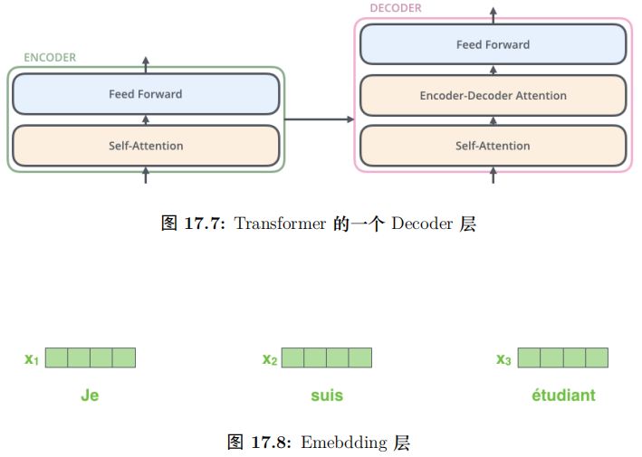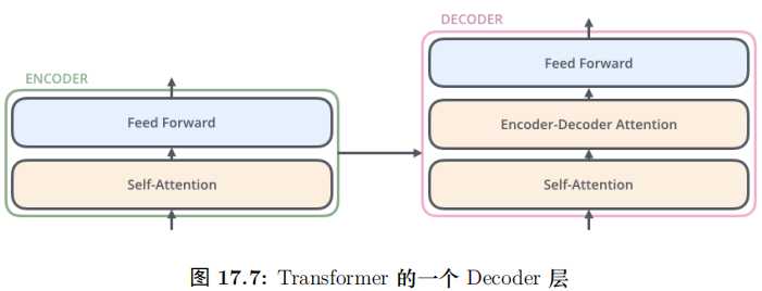 每一层的 Encoder 都是相同的结构,它有一个 Self-Attention 层和一个前馈网络(全连接网络) 组成,15.54如图所示。每一层的 Decoder 也是相同的结果,它除了 Self-Attention 层和全连接层之外还多了一个普通的 Attention 层,这个 Attention 层使得 Decoder 在解码时会考虑最后一层 Encoder 所有时刻的输出。它的结构如图17.3所示。