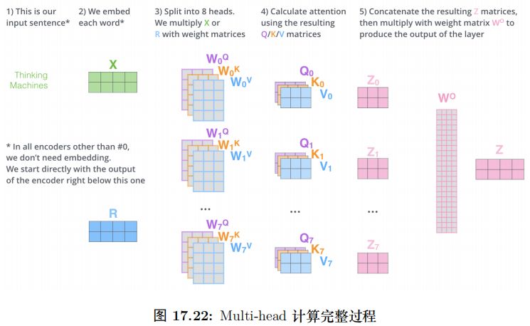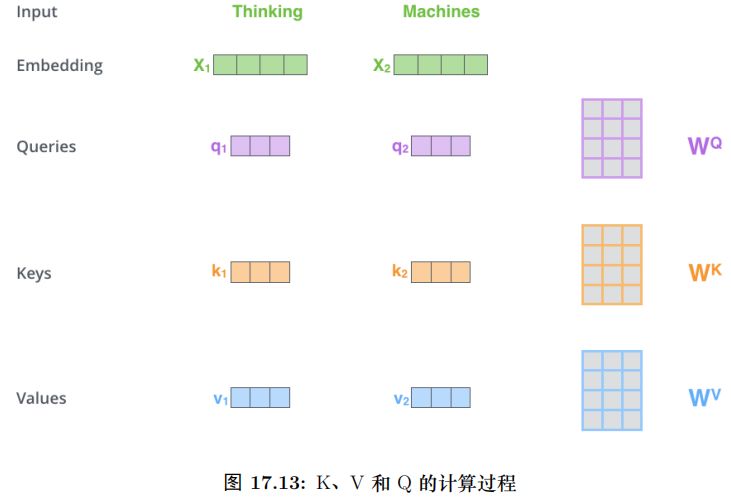 接下来就是计算 Q 和 K 得到 score,然后除以,然后再 softmax,最后加权平均得到输出。全过程如图17.14所示。