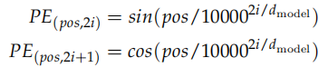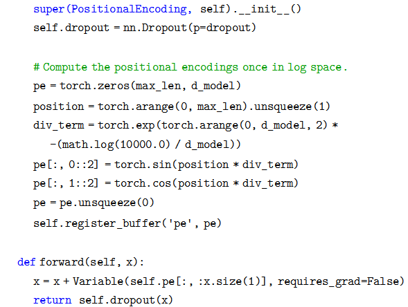 假设输入是 ID 序列长度为 10,如果输入 Embedding 之后是 (10, 512),那么位置编码的输出也是 (10, 512)。上式中 pos 就是位置 (0-9),512 维的偶数维使用 sin 函数,而奇数维使用 cos 函数。这种位置编码的好处是:可以表示成 PEpos 的线性函数,这样网络就能容易的学到相对位置的关系。代码为: