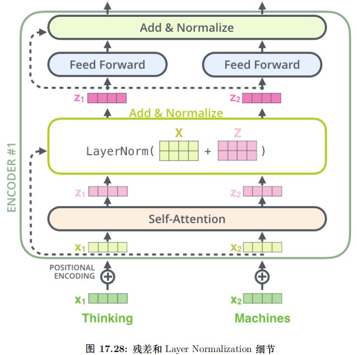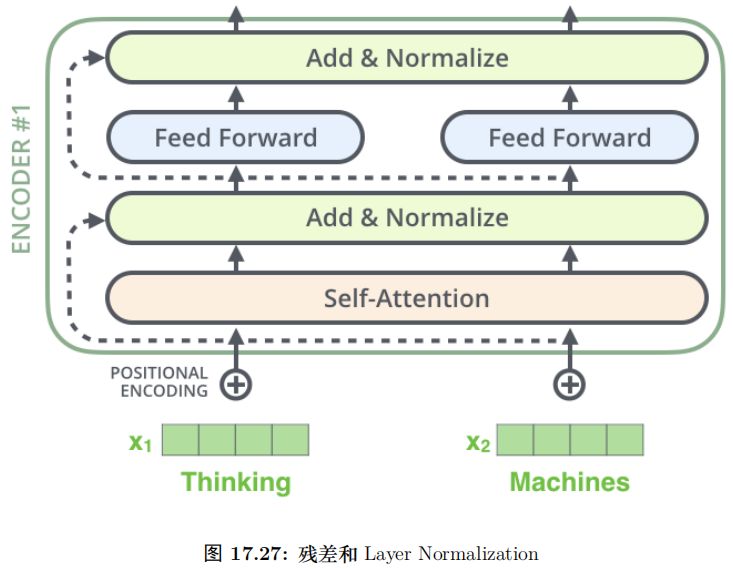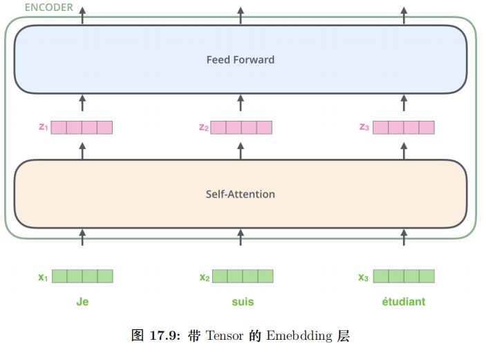 Embedding 之后的序列会输入 Encoder,首先经过 Self-Attention 层然后再经过全连接层,如图17.5所示。