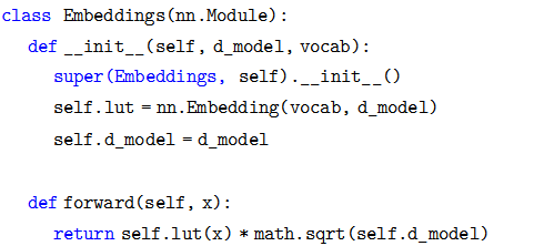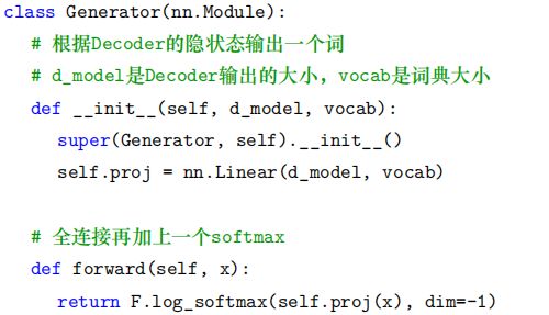 我们首先后面三个简单的参数,Generator 直接构造就行了,它的作用是把模型的隐单元变成输出词的概率。而 src-embed 是一个 Embeddings 层和一个位置编码层c(position),tgt-embed 也是类似的。