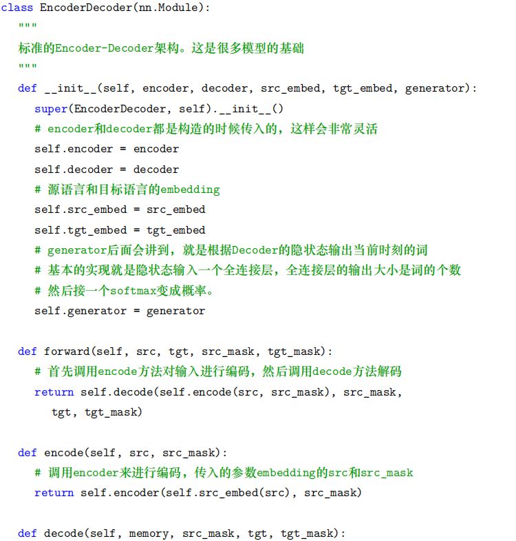 这里介绍了 Transformer 最核心的算法,这个代码还包含了 Label Smoothing,BPE等技巧,有兴趣的读者可以自行阅读,本书就不介绍了。