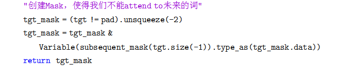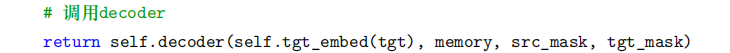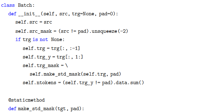 对于训练来说 (TeachingForcing模式),Decoder 有一个输入和一个输出。比如句子”<sos> it is a good day <eos>”,输入会变成”<sos> it is a good day”,而输出为”it is a good day <eos>”。对应到代码里,self.trg 就是输入,而 self.trg_y 就是输出。接着对输入 self.trg 进行 mask,使得 Self-Attention 不能访问未来的输入。这是通过 make_std_mask 函数实现的,这个函数会调用我们之前详细介绍过的subsequent_mask函数。