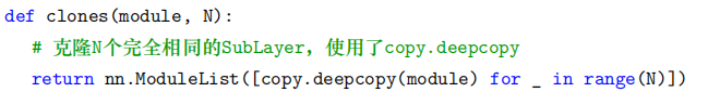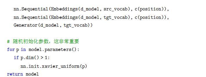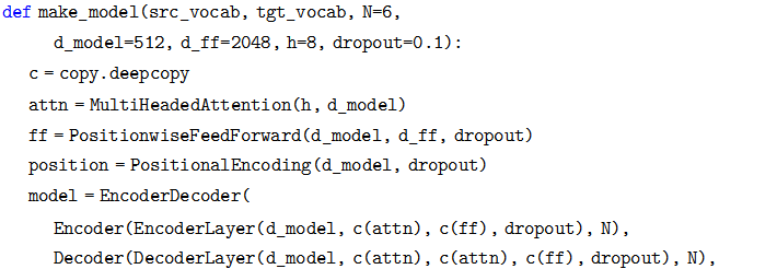 首先把 copy.deepcopy 命名为 c,这样使下面的代码简洁一点。然后构造 MultiHeadedAttention,PositionwiseFeedForward 和 PositionalEncoding 对象。接着就是构造 EncoderDecoder 对象。它需要 5 个参数:Encoder、Decoder、src-embed、tgt-embed和 Generator。