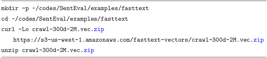 然后从https://github.com/facebookresearch/SentEval.git clone 代码。SentEval 提供了一些baseline 系统,包括 bow、infersent 和 skipthought 等等。读者如果实现了一种新的Sentence Embedding 算法,那么可以参考 baseline 的代码用 SentEval 来评价算法的好坏。