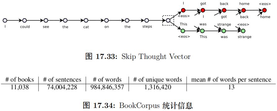 我们之前学习过 word2vec,其中一种模型是 Skip-Gram 模型,根据中心词预测周围的 (context) 词,这样我们可以学到词向量。那怎么学习到句子向量呢?一种很自然想法就是用一个句子预测它周围的句子,这就是 Skip Thought Vector 的思路。它需要有连续语义相关性的句子,比如论文中使用的书籍。一本书由很多句子组成,前后的句子是有关联的。那么我们怎么用一个句子预测另一个句子呢?这可以使用Encoder-Decoder,类似于机器翻译。比如一本书里有 3 个句子”I got back home”、”I could see the cat on the steps”和”This was strange”。我们想用中间的句子”I could see the cat on the steps.” 来预测前后两个句子。