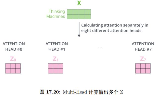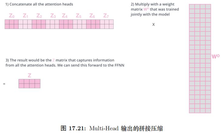 把多个 head 输出的 Z 按照第二个维度拼接起来,但是这样的特征有一些多,因此Transformer 又用了一个线性变换 (矩阵 WO) 对它进行了压缩。这个过程如图17.17所示。