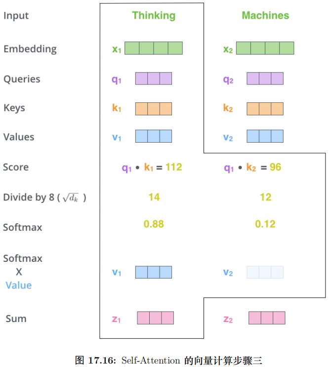 接下来用 softmax 得到的概率对所有时刻的 V 求加权平均,这样就可以认为得到的向量根据 Self-Attention 的概率综合考虑了所有时刻的输入信息,计算过程如图17.12所示。