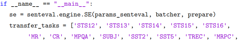 为了解决这些问题,Facebook 做了 SentEval 这个工具。这是一个用于评估Universal Sentence Representation 的工具,所谓的 Universal Sentence Representation是指与特定任务无关的通用的句子表示 (Embedding) 方法。为了保证公平公正,这个工具只评价句子的 Embedding,对于具体的任务,大家都使用相同的预处理,网络结构和后处理,从而能够保证比较公平的评测。