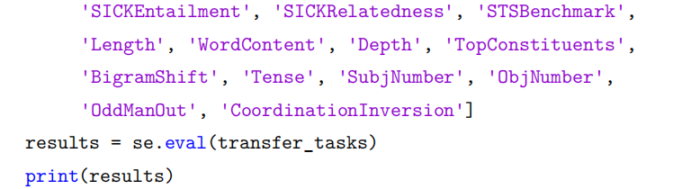 首先构造 senteval.engine.SE,然后列举需要跑的 task,最后调用 se.eval 得到结果。