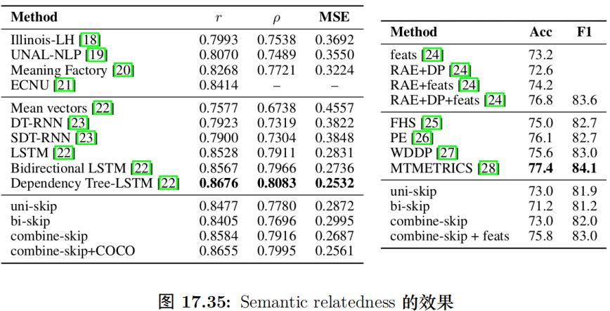 它们的输入是两个句子,输出是分类数。对于输入的两个句子,我们用 SkipThought Vector 把它们编码成两个向量 u 和 v,然后计算 u · v 与 |u − v|,然后把它们拼接起来,最后接一个 logistic regression 层 (全连接加 softmax)。使用这么简单的分类模型的原因是想看看 Sentence Embedding 是否能够学习到复杂的非线性的语义关系。使用结果如图15.85所示。可以看到效果还是非常不错的,和 (当时) 最好的结果差别不大,而那些结果都是使用非常复杂的模型得到结果,而这里只使用了简单的逻辑回归模型。