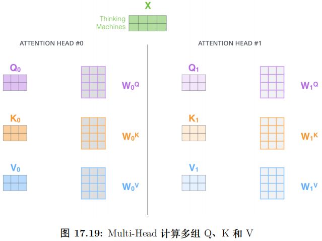 计算 Q、K 和 V 的过程还是一样,这不过现在变换矩阵从一组