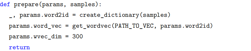 这个函数相当于初始化的回调函数,参数会传入 params 和 samples,samples 就是所有的句子,我们需要根据这些句子来做一些初始化的工作,结果存在 params 里,后面会用到。这里我们用 samples 构造 word2id——word 到 id 的映射,另外根据word2id,从预训练的词向量里提取需要的词向量 (因为预训练的词向量有很多词,但是在某个具体任务中用到的词是有限的,我们只需要提取需要的部分),另外把词向量的维度保持到 params 里。