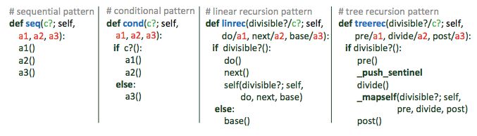 本文提出用四个组合子来表征算法任务中最常见的四种编程模式:顺序模式、条件模式、线性递归和树形递归(即多重递归)。四个组合子的伪代码见图 2。