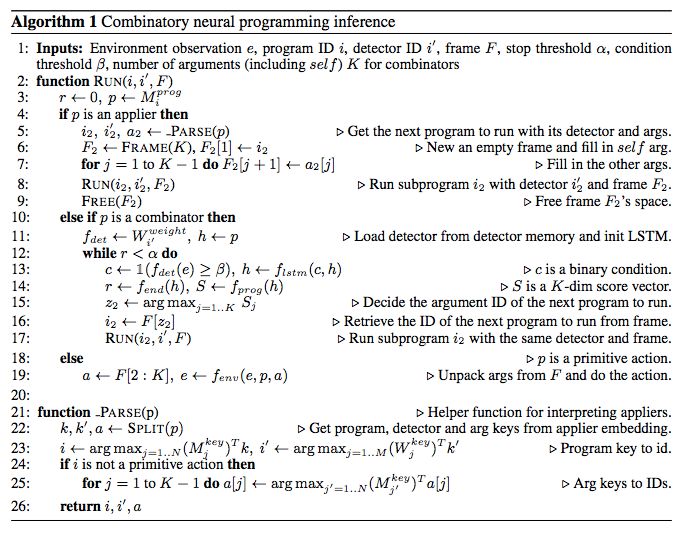 这些模型中的一个特例是神经编程器-解释器(NPI)(Reed & de Freitas, 2016)及其支持递归的扩展形式(Cai et al., 2017,在该论文中被称为 RNPI)。NPI 包含三个组件:一个核心控制器,通常由递归神经网络(RNN)实现;一个程序存储器,用于存储已学得程序的嵌入向量;还有多个特定域编码器,让单个 NPI 在多种环境中均可运行。核心控制器不学习任何特定的程序,而是学习解释任何一个用向量表示的程序,即模仿一个通用图灵机。核心控制器(即解释器)与已学得程序的存储器(即编程器)相结合,使 NPI 能够通过合子程序来学习新的程序,其架构更灵活也更具可组合性。然而,NPI 在理论和实际应用方面依然存在一些局限。